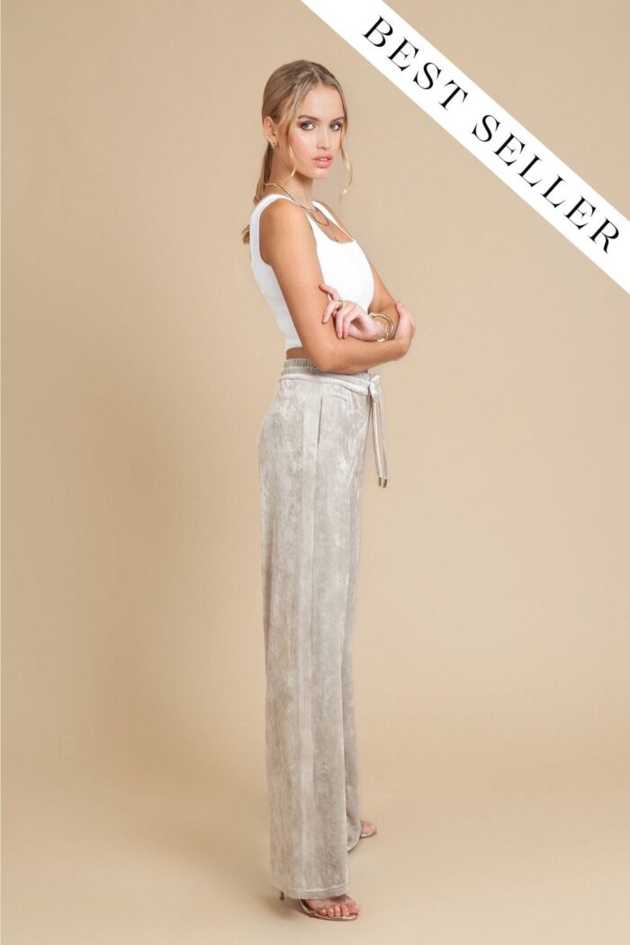 DAGO pants feature a wide silhouette and a high waist. They are essential basics in your wardrobe. Effective stripes on the sides of the pants add playfulness and uniqueness. The waist string which can be removed for finer occasions is decorated with light gold-tone details.