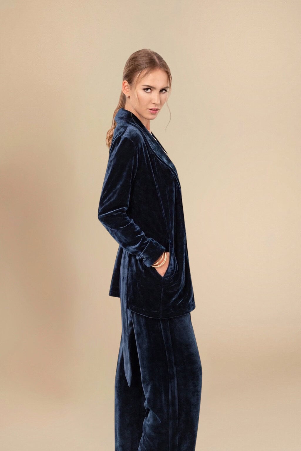 Эта модель характеризуется слегка удлиненным силуэтом, оснащенным двумя удобными карманами и поясом, который гармонично дополняет брюки, джинсы и платья Velvedean.